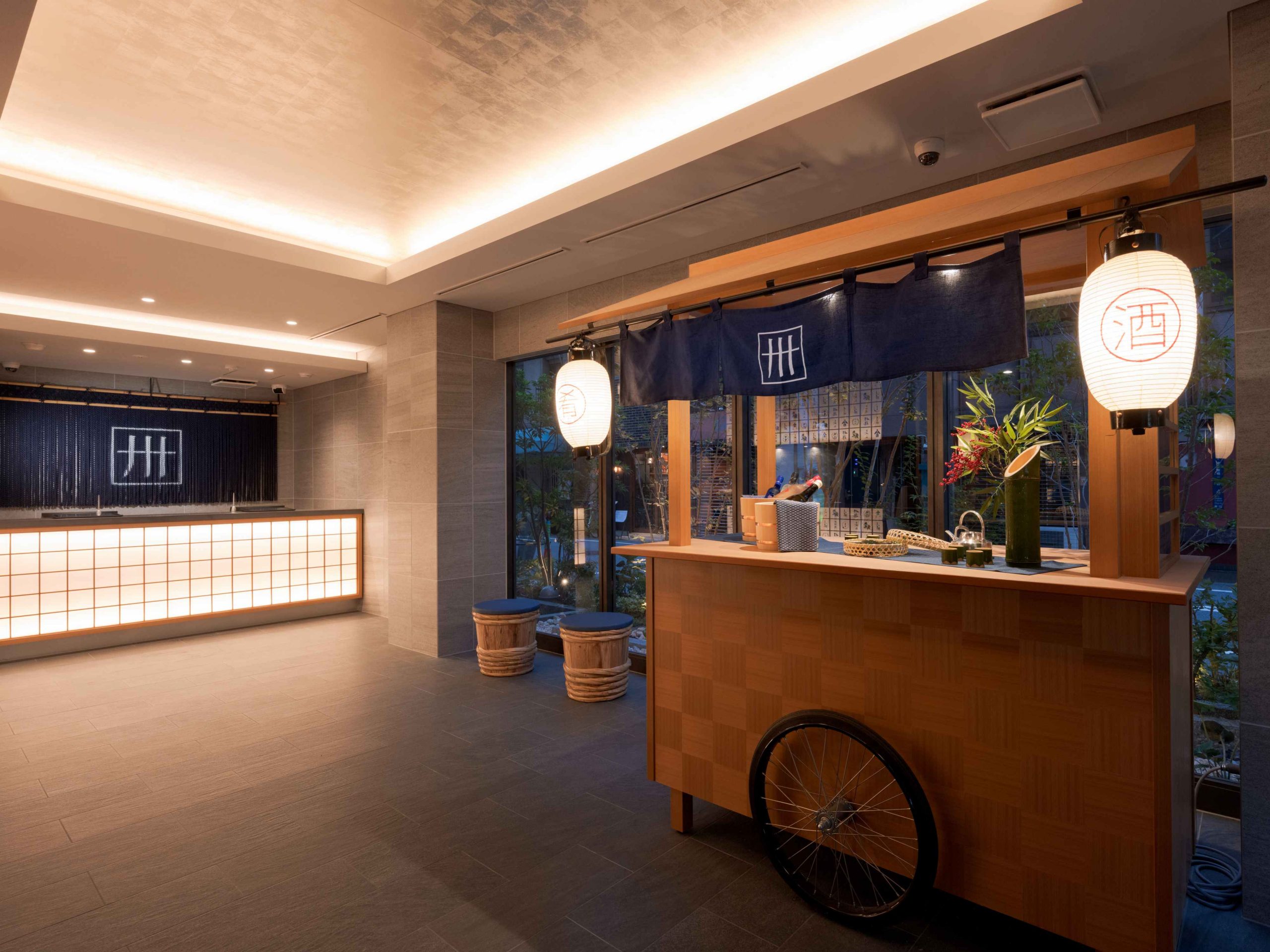 エントランスから一歩足を踏み入れると、のれん、提灯、屋台、酒樽など、日本の粋なデザインを集めた「IZAKAYA」空間が広がります。ウェルカムサービスの日本酒やソフトドリンク・駄菓子で、みんなで集まった記念に乾杯したり、出がけや寝る前に一杯飲んだり、時間に縛られず、お酒と会話で深まる「ほろ酔い」コミュニケーションをお楽しみいただけます。