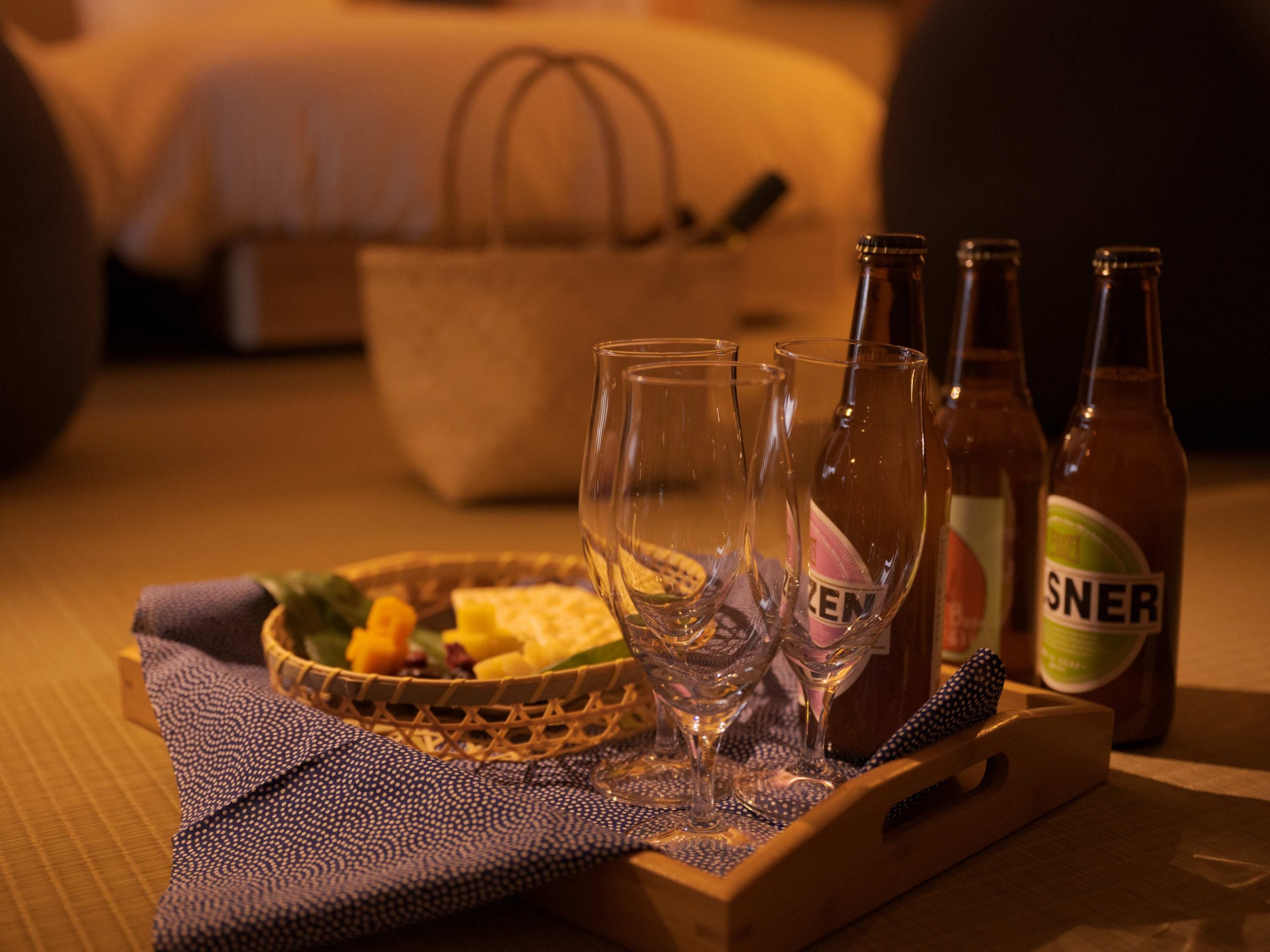 「まどい」とは円く集まること、楽しく会合する団らんのことを言います。仲間と集まる機会が増えてきたいま、まったりと飲み明かしていただけるようなお部屋をご用意しました。「まどいの極み部屋」は、欧米ゲストからも人気の高い、靴を脱いで足を伸ばせる和室に、車座でくつろげるビーズクッションを並べました。また、ホテルでセレクトした日本酒やビールなどのアルコール類に加え、スナックや駄菓子、ナッツなどを、ご宿泊代金にオールインクルーシブでご準備しています。さらに、リラクゼーショングッズやボードゲームもフリーで使える、至れり尽くせりの特別ルーム。お部屋に入って、部屋着に着替えたら、時間やまわりを気にせず、「まどい」の極みをお楽しみください。