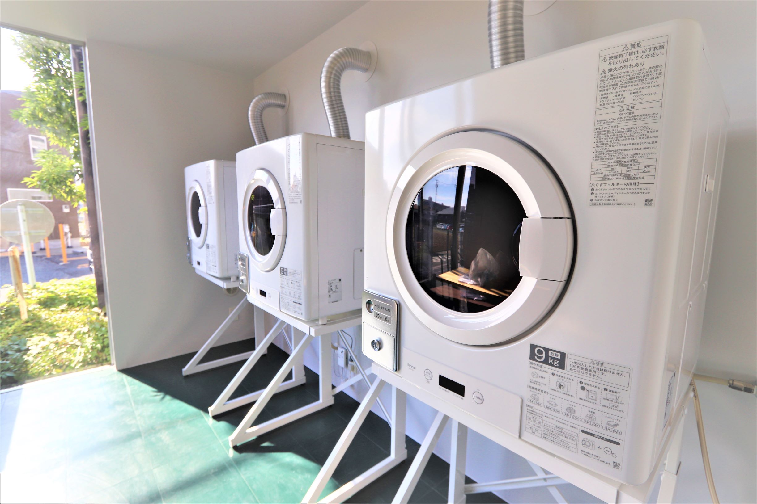 衣類乾燥サービスは、ガス衣類乾燥機を搭載した「衣類乾燥機付きトレーラーハウス」を、当社がオーナーさまからお借りした駐車場空き区画に設置し、入居者さまが24時間いつでもご利用いただけるサービスです。利用料の支払いはキャッシュレス決済を採用しています。