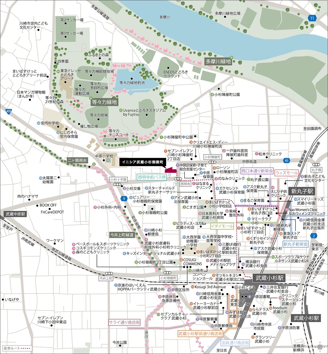 『イニシア武蔵小杉御殿町』は、JR南武線・横須賀線・湘南新宿ライン「武蔵小杉」駅徒歩13分、東急東横線・目黒線「新丸子」駅徒歩11分に位置し、周辺は、「グランツリー武蔵小杉」などの大型商業施設や、昔ながらの青果店や精肉店が並ぶ商店街など利便性の高い立地です。一方で、「等々力緑地」徒歩6分、「多摩川緑地」も徒歩圏にあるなど生活利便性と自然環境の両方が備わっています。