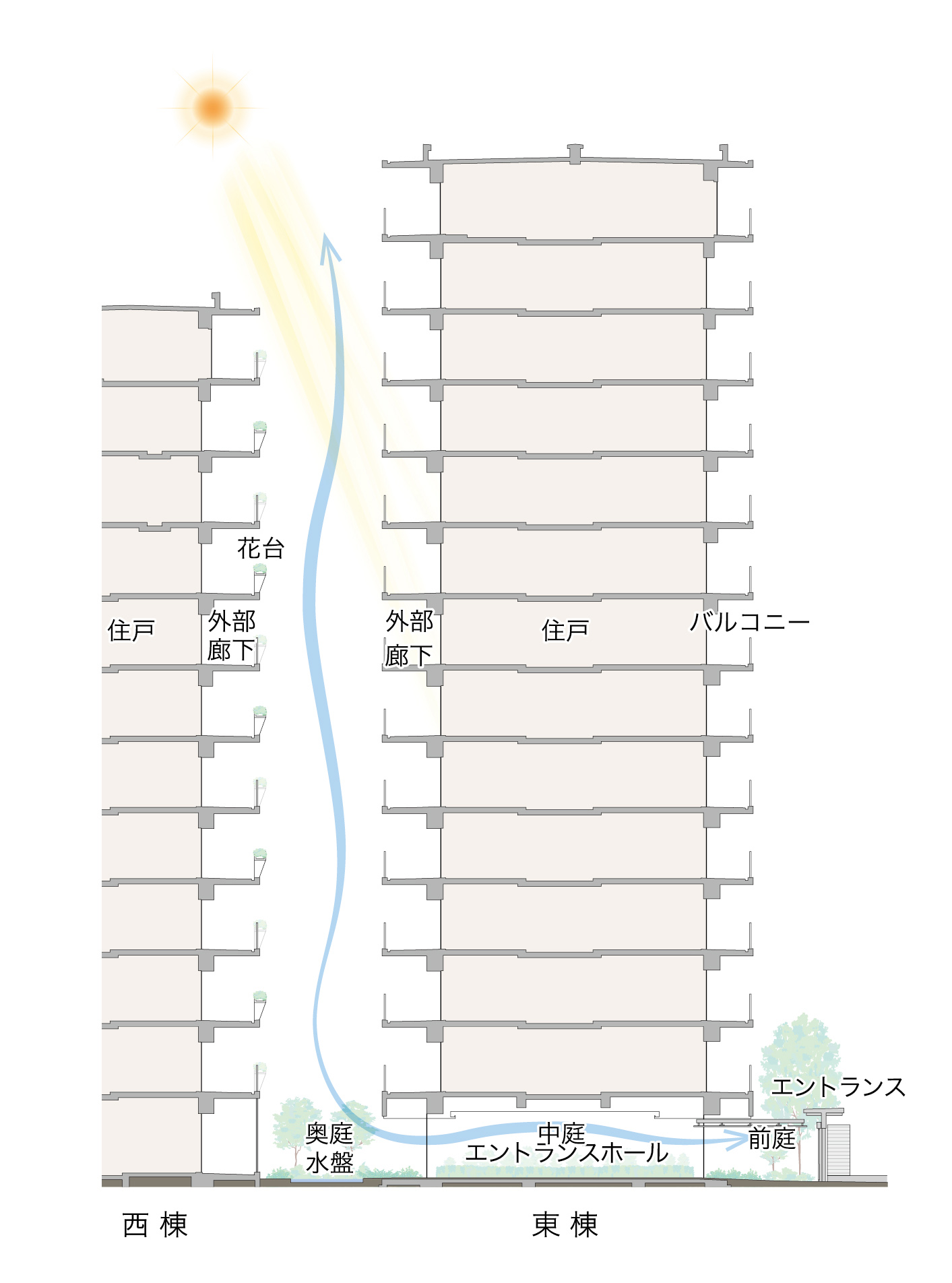 自然光や通風を効果的に取り入れる立体的な建築構成とし、共用部には植栽や水景を取り入れた空間を計画しました。外部から敷地内へと連続する緑のアプローチや、東棟1階には中庭的な共用スペースを設けることで、日常の動線の中で自然を身近に感じられる住環境を創出しています。また、外観デザインには木調や自然素材を想起させる色合いを採用し、御殿町の落ち着いた住宅地の街並みと調和する佇まいを形成。敷地内の植栽計画も含め、時間の経過とともに街に馴染んでいく建築・ランドスケープを目指しました。また、低層住宅街の立地を活かし、下層階からでも開けた視界を確保。上階からは周辺に広がる街並みを望むことができ、住戸位置に応じた眺望を楽しめる環境としています。