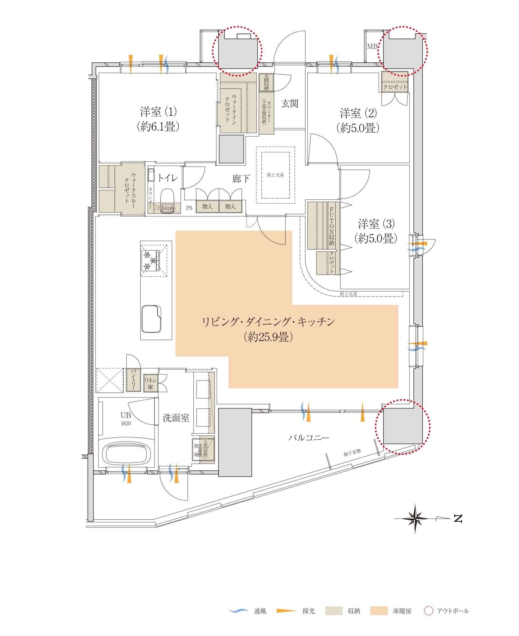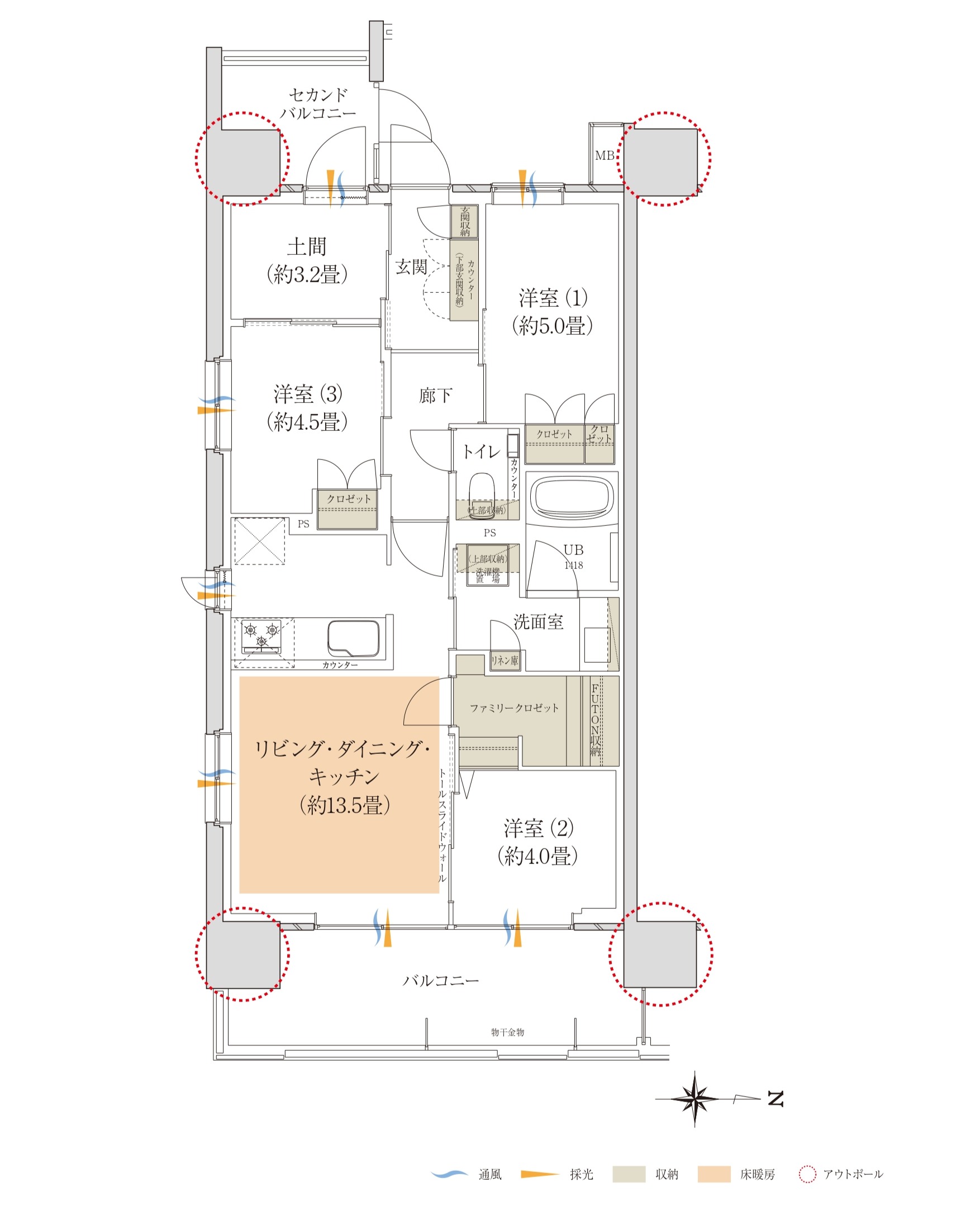 本物件は環境性能にも配慮し、「ZEH-M Oriented※1」基準をクリア。断熱性を高めて高効率の省エネ設備機器を採用することにより、居住者が快適に過ごせると同時に、地球環境保護にも貢献する住まいを実現しています。