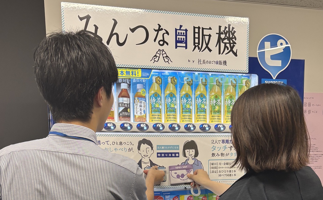 職場内に健康的な飲料を販売する自動販売機を設置しています。この自動販売機は、従業員同士2人で同時にタッチして、10秒以内に商品をそれぞれ選択すると、2人の飲料が無料になる”おごり機能”が付いており、従業員のコミュニケーションのきっかけとなっています。利用するたびに健康に、そして楽しくなる自動販売機です。