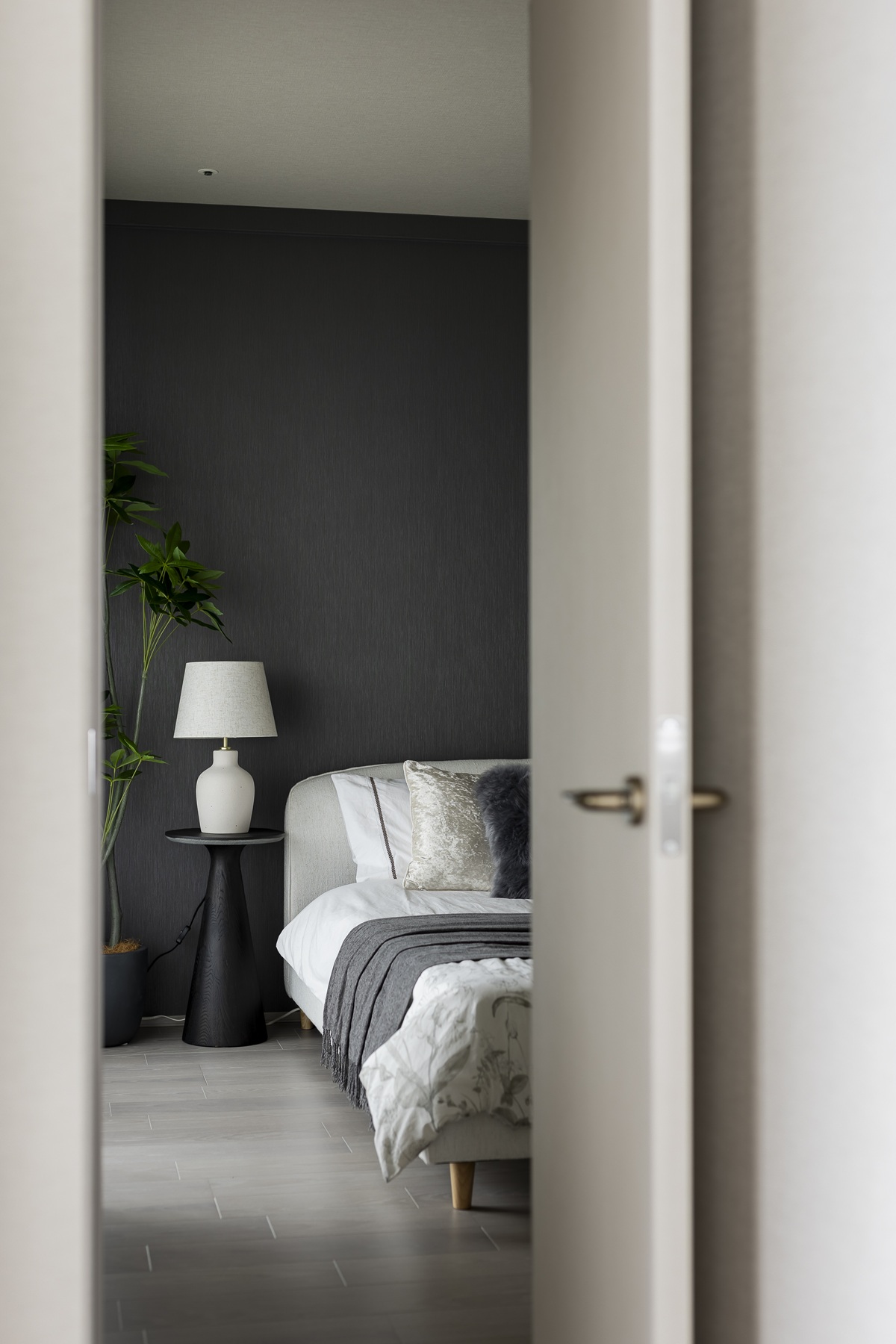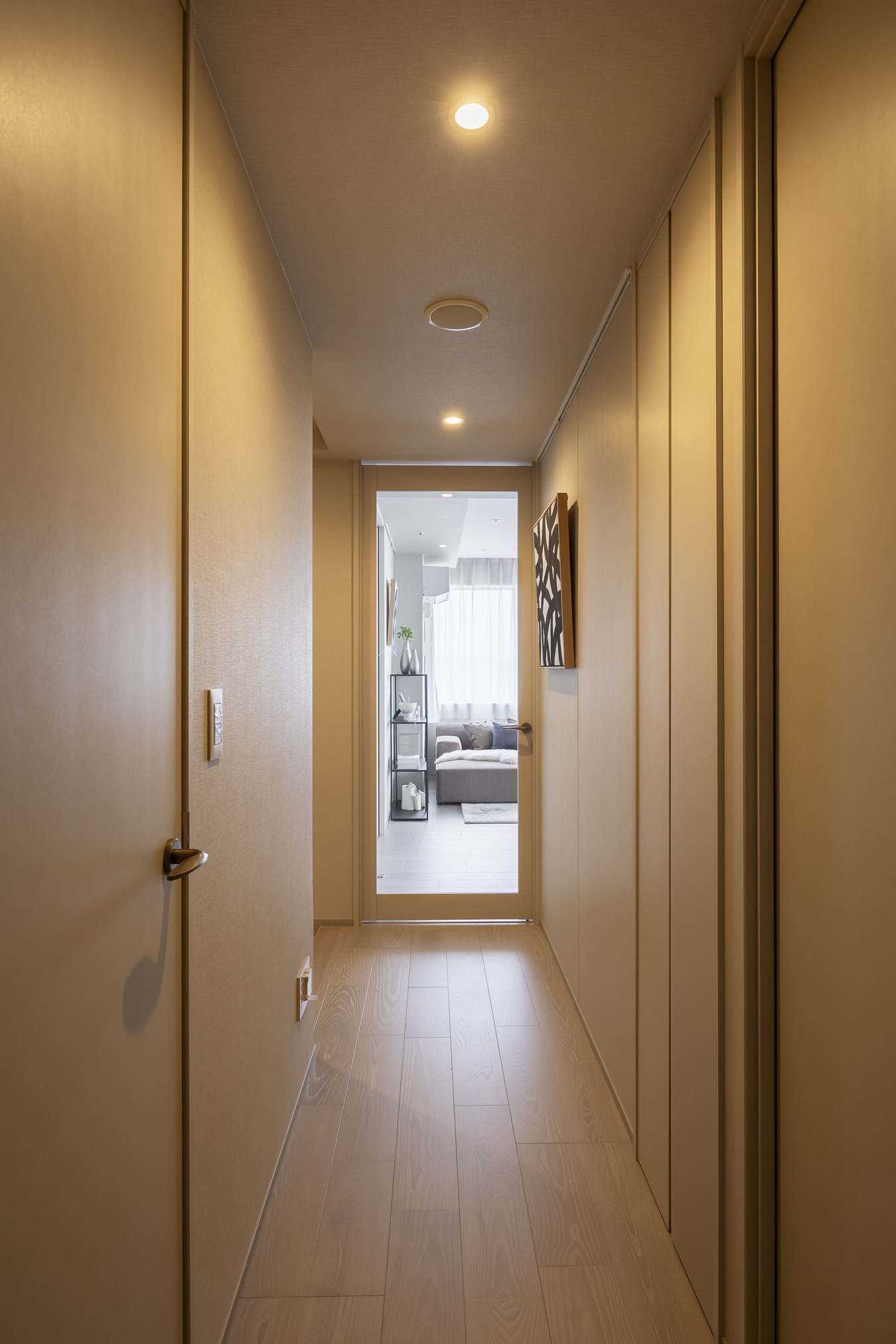 『ローレルタワーサンクタス梅田』の一室においては、竣工に合わせ、内装・建具を空間全体を構成する一部として捉え直す住まい提案を行いました。内装や建具を単体の要素として強調するのではなく、壁・床・天井との関係性を整理することで、視線のつながりや一体感を高め、限られた面積の中でも広がりを感じられる空間を目指しています。