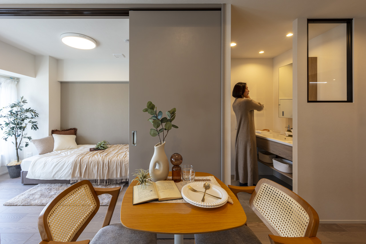 東京で販売したリノベーションマンション『ストーク武蔵小山』(東京都品川区)の一室においては、洗面化粧台を従来の脱衣所内に限定せず、住まいの動線上で多用途に使える空間として再定義することで、限られた住戸面積の中でも暮らし方の自由度を高める住まいづくりを行いました。洗面を暮らしの中心に近づけることで、身支度や手洗いにとどまらず、家事準備や日常の軽作業など、さまざまな行為に柔軟に対応できる空間としています。