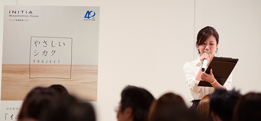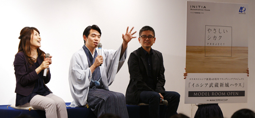 中入り後は、花緑さん、AXIS編集長・石橋勝利さん、コスモスイニシア マンション事業部の髙田綾子によるトークショー。髙田より「イニシア武蔵新城ハウス」(販売済)とそのコンセプトである「やさしいシカク」についてのご紹介。「やさしいシカク」とは、住む人のすごしかたに合った空間を、大切にする考え方。凸凹がなくて、自由で、フラットで、伸びやかな、空間づくり。シンプルで、やさしくて、あたたかい、居心地のいい住まいのカタチです。