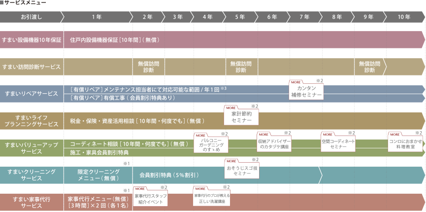 - 3.すまいリペアサービス(建具・扉・床フローリングなどの補修・調整を年1回、マンション毎に日にちを決め、1時間以内の補修対応を10年間無償実施(一部有償))