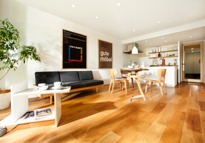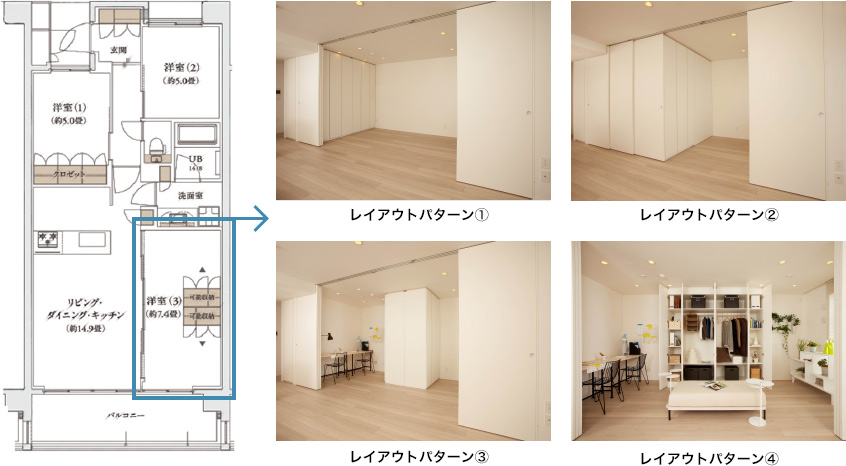 すっきりとした空間を活かし、間取りの使い方を指定せず、住まう方が自在に住みこなせる可動家具やスライドウォールを採用しています。ライフステージの変化に応じた多彩なレイアウト・住まい方が実現できます。