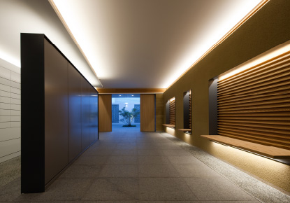 左官職人による左官仕上げの“土の壁”を施したエントランス