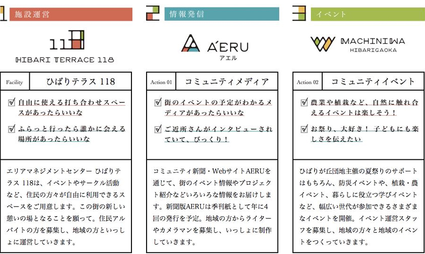 現地には事務局が常駐し、「ひばりテラス118」の施設運営やコミュニティメディア「AERU」の発行、コミュニティ醸成のためのさまざまなイベントを住民とともに行っていきます。