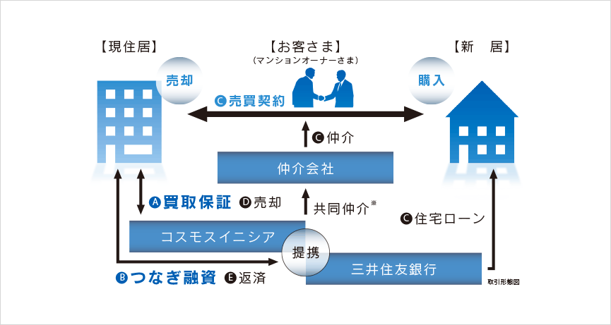 (C)上記A・Bを経て、新居のご契約を締結します。新居の住宅ローンも株式会社三井住友銀行が融資します。なお新居購入に際しての不動産会社は、コスモスイニシアとの共同仲介を前提に、コスモスイニシア以外の仲介会社または販売会社でも可能です。