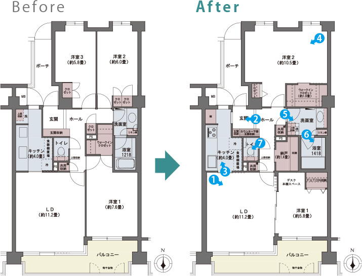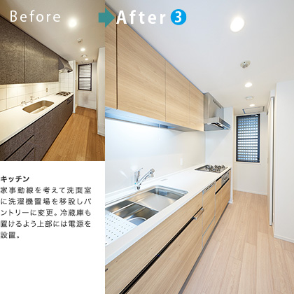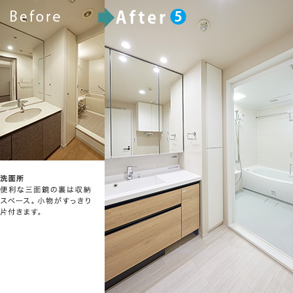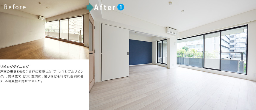 扉は今すごく使っていて、便利ですしやってよかったと非常に満足しています。でもやっぱり、新築マンションの経験を生かしたコスモスイニシアさんのご提案には目を見張るものがありました。たとえば、リビングと洋室の間の壁を3枚の引き戸にしましょうとか、掃除がしやすいようレールがない方がいいですとか。洗面化粧台のボウルが片側に寄せてあるのもすごく使いやすい。いろんなデータを研究したからこその間取りや設備をご提案いただいて、本当に住みやすいと感じながら過ごせています。