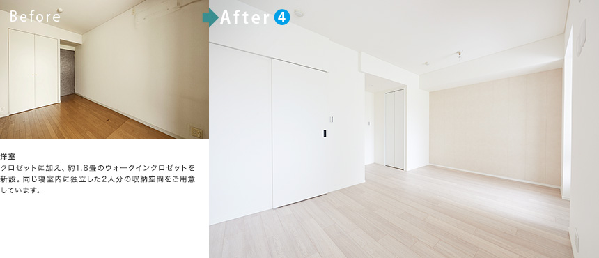 空間づくりでは、ご要望を一つひとつをお伝えいただきながら一緒にカタチにしていきました。まずは、間仕切り壁を取り払って広さを確保した寝室ですが、印象の違う2面の壁がとてもキレイに映えています。