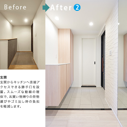 まさにお手本のようにモデルルームをご活用いただけたようで何よりです。玄関から直接キッチンへ入れる扉を新設したのも、そういったSさまならではの観点でご要望をいただいたからでした。