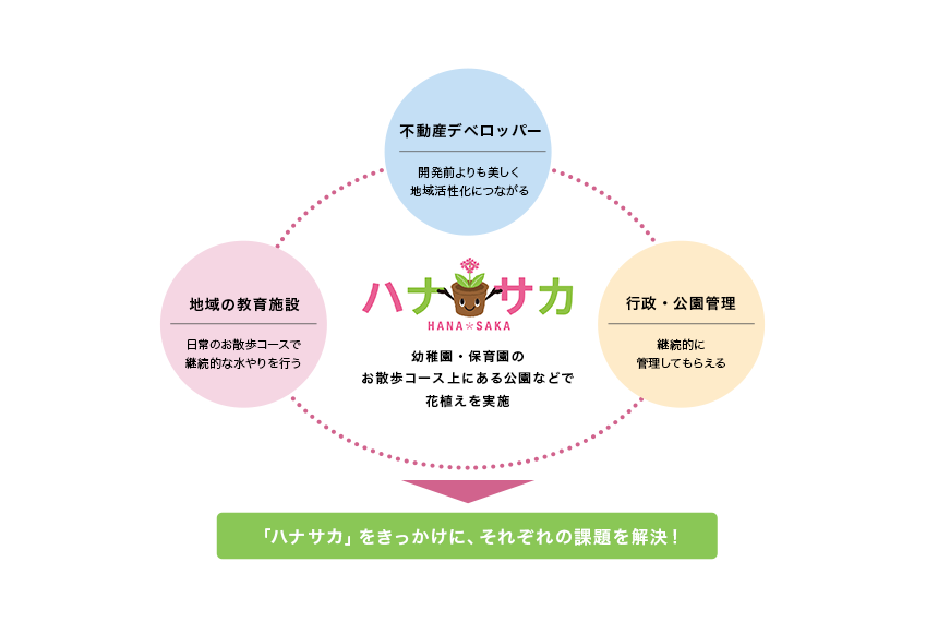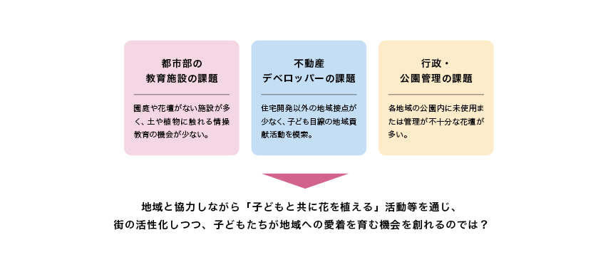 地域のみなさまのご意向や課題をお伺いする中で、都市部において園庭がない幼稚園・保育園が多く、子どもたちが土や植物に触れる情操教育の機会が少ないこと、また公園内に未使用または管理が不十分な花壇が多いことを知りました。不動産デベロッパーとして「子どもと共に花を植える」活動を通じ、街を活性化しつつ子どもたちが地域への愛着を育む機会を創りたいと考えました。
