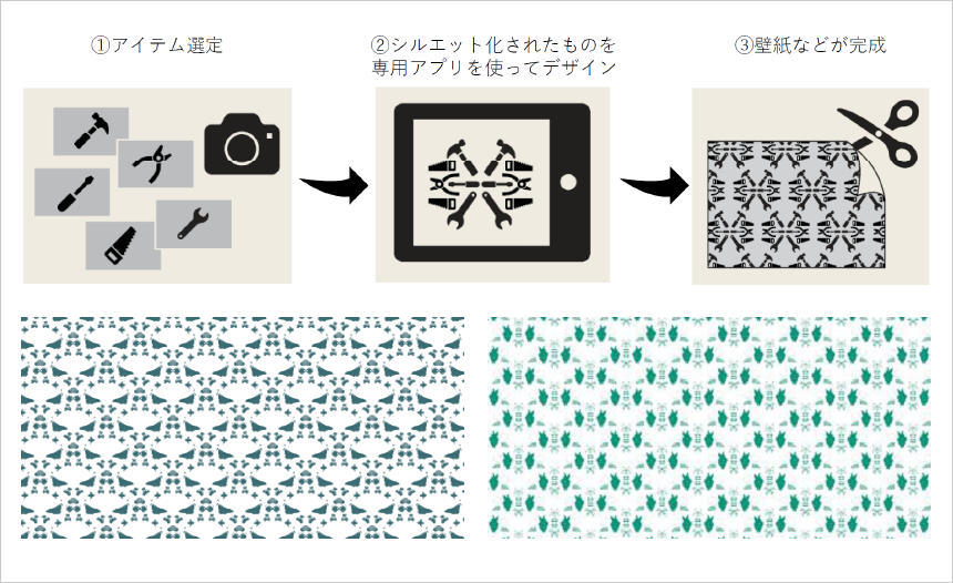 まずはお客さまが、ご家族の大切な思い出やお子さまの記念の品、大好きなペットや趣味・お気に入りの道具などの写真や画像を選定します。その後、タブレット端末を使用し、シルエット化された画像をアプリで自由に配置・デザインすれば、簡単にオリジナルのダマスク模様※をつくることが可能です。オリジナルのダマスク模様は壁紙やファブリックなどに出力し、施工・制作することで「思い出/お気に入り」を生活の中に溶け込ませることができます。