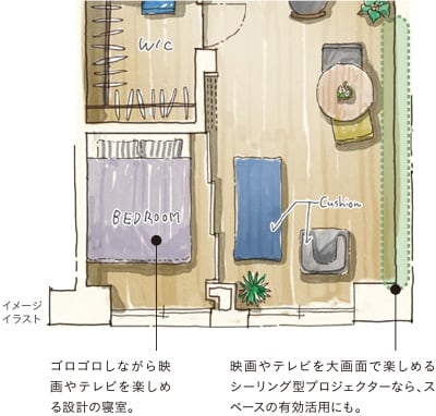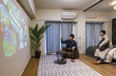おうち映画館をイメージして、壁に映像がきちんと映るように、リビングの壁面にプロジェクター用の壁紙を設置。休日はソファに座ってまったりと映画鑑賞やスポーツ観戦を満喫するなど、アイデア次第でふたりですごすおうち時間がもっと楽しくはるはずです。
