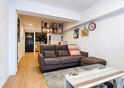 K様:堀江は心斎橋にも歩いて行けますし、スーパーやコンビニも近くに充実していて、住むことはもちろん、仕事をするにも遊びに出かけるにも便利。妻が元々、堀江の賃貸マンションに住んでいたこともありまして、結婚後に住むならこの辺りがいいなと思っていました。新築物件は予算オーバーだったので、中古物件に限定して物件を探していましたが、この物件はリノベーション済みということで、内装はすべて新規で綺麗。細部のデザインにもこだわりが感じられました。共用部にはオートロックが完備されていて安心できました。