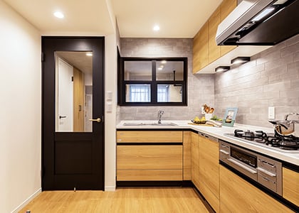 K様:物件検討時はカウンターキッチンを希望していましたが、夫婦で料理を作ることも多いので、ふたりが並んで作業できるスペースが確保できるL字型壁付けキッチンは、むしろわたし達のライフスタイルにぴったりでした。キッチンからリビングが見渡せる一体感と開放感もお気に入りのポイントです。