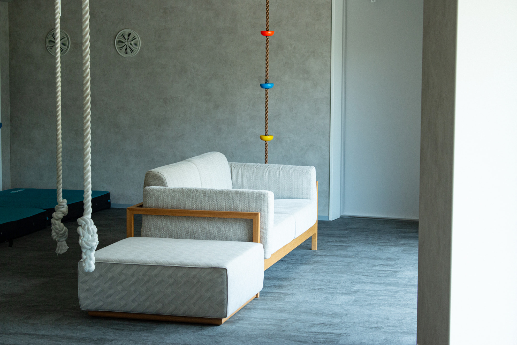 天井からぶら下がれるロープをつけたり、遊べるコンテンツを用意しました。