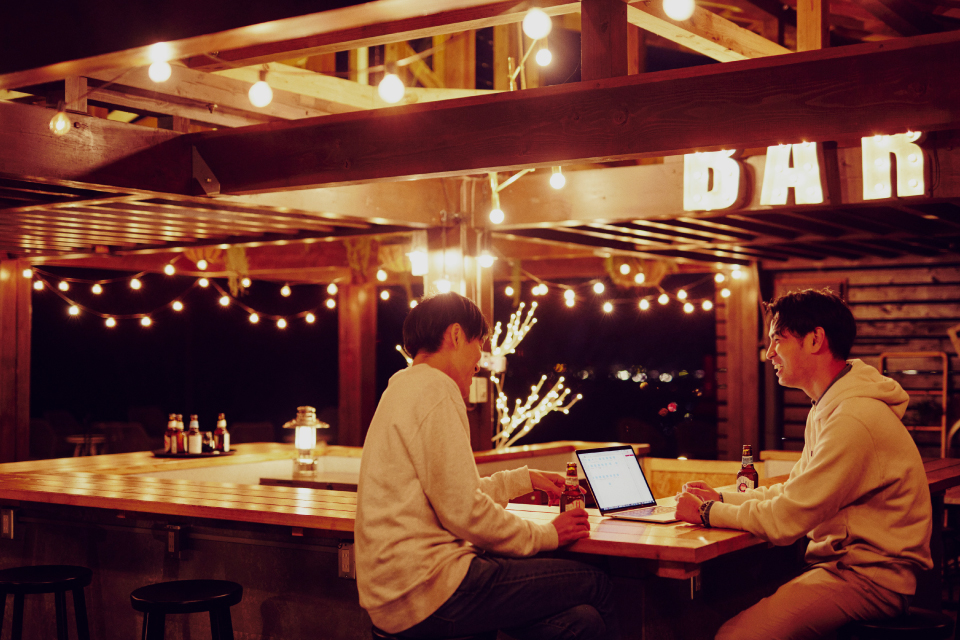 景色を一望しながらひと休みできるバースペース。昼はコーヒー、夜はビールが相棒です。開発合宿など、ふと煮詰まってしまった時におすすめです。全員でご昼食や気分転換などにどうぞ。