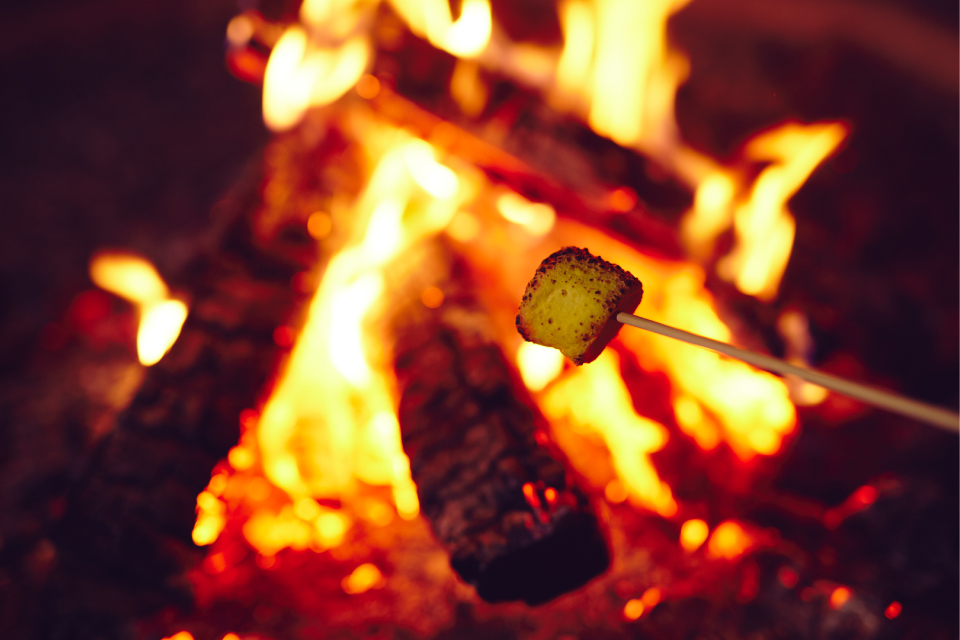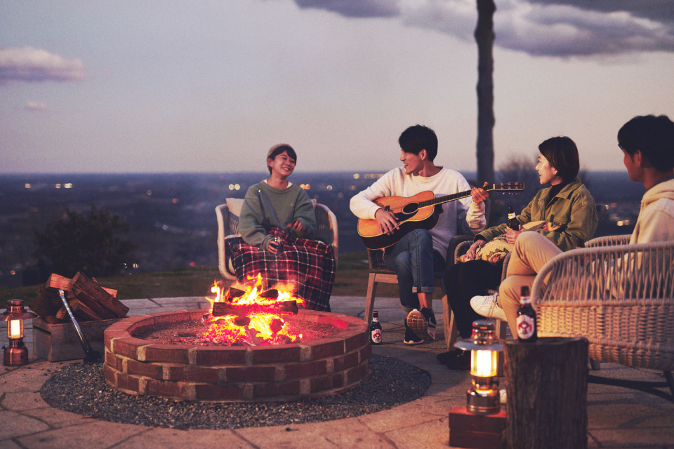 開放的なファイアープレイス。夜は薪をくべて、仲間と語りあうことも。炎を見つめているだけで普段は話せないことも話せるかも。