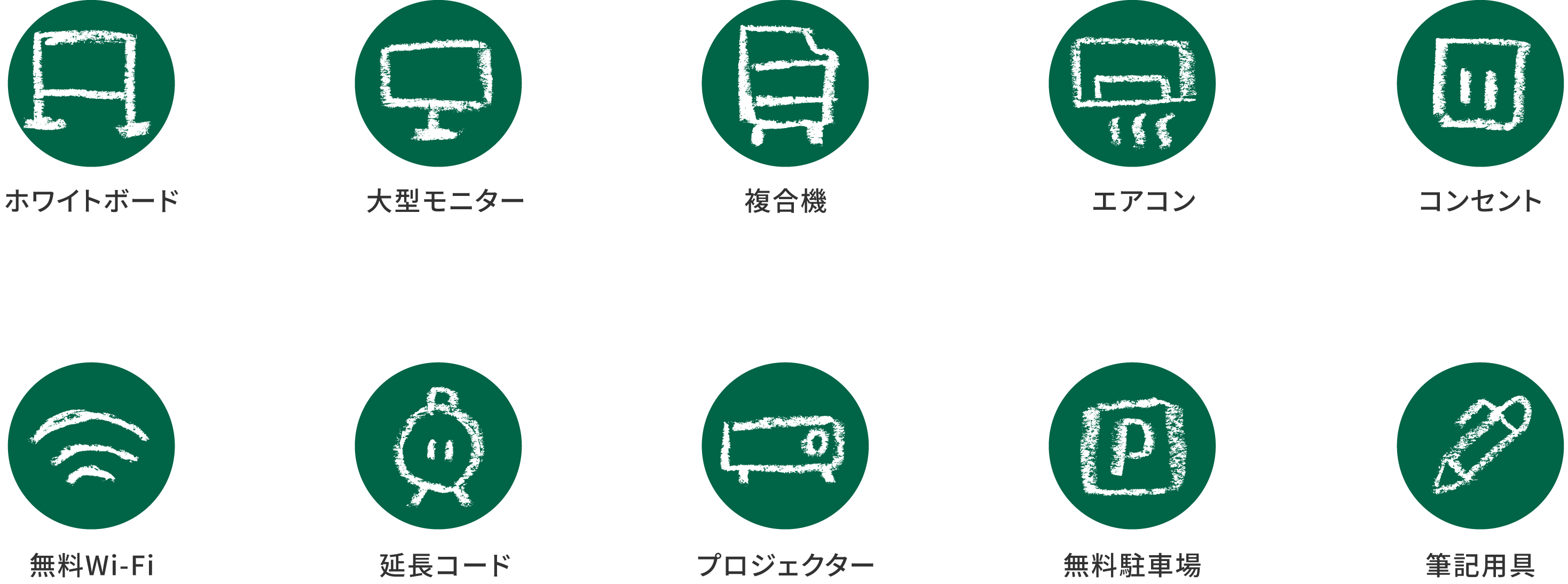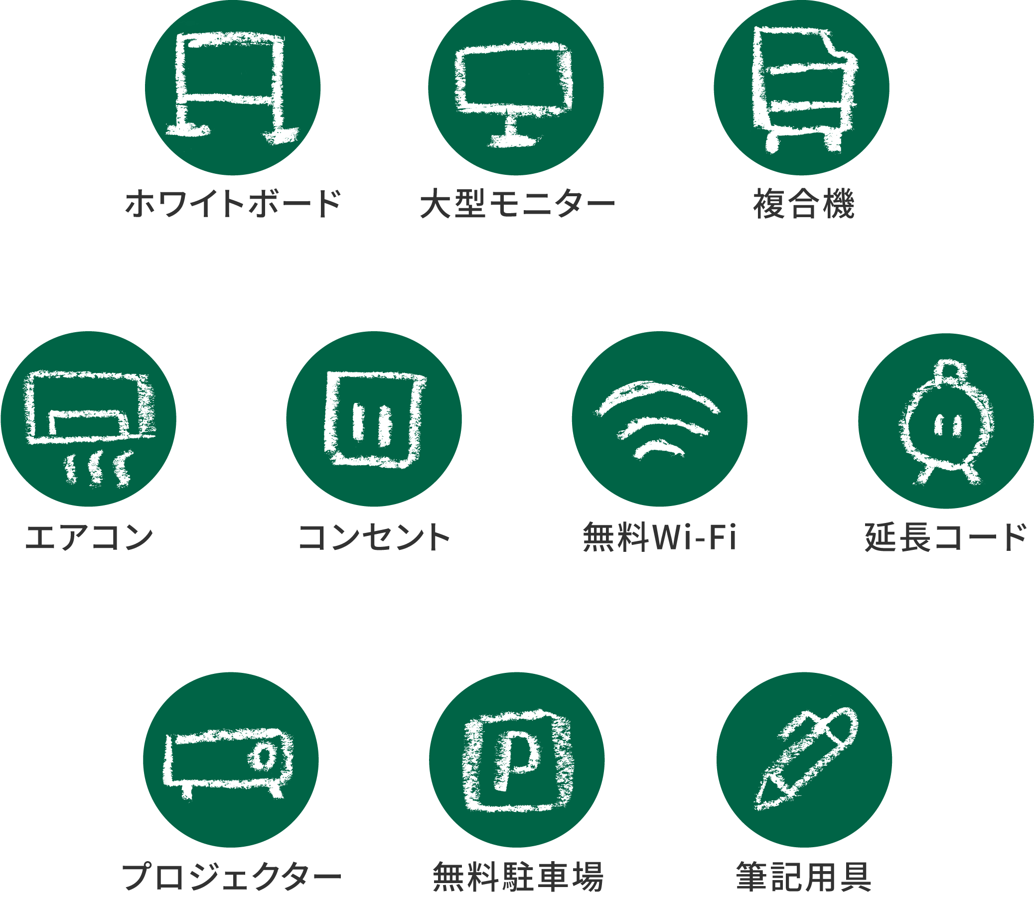 ○Wi-Fi、大型モニター、ホワイトボード、ケーブルなど無料でご利用いただけます。
