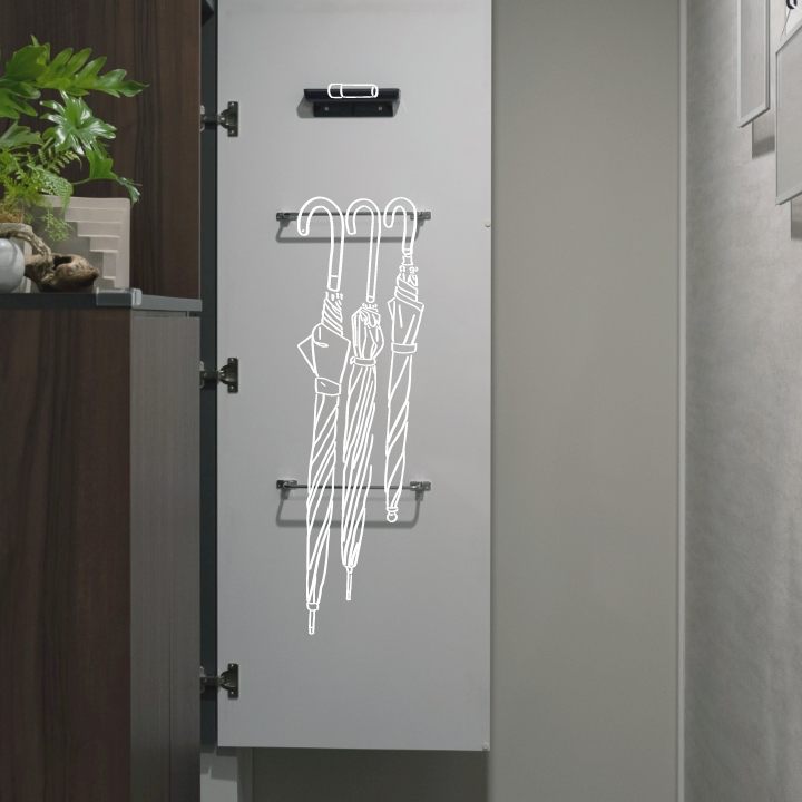 開いても外から見えない玄関横の収納には、印鑑を忍ばせて。乾いた傘もスッキリ収納することができます。