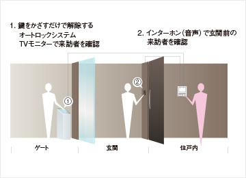 建物のゲートと各住戸の玄関で2重のセキュリティを構築。2ヶ所で来訪者をセキュリティチェックすることで、不審者の侵入を未然に抑制し、お住まいになる方のプライバシーや暮らしの安全に配慮しました。