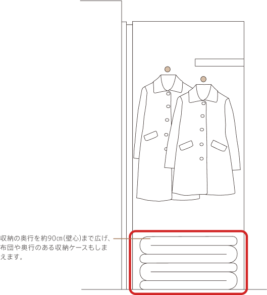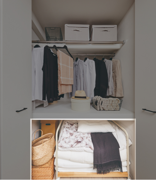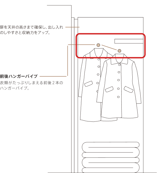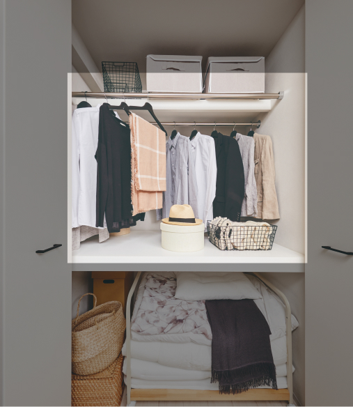 ハンガーパイプを前後に設置することで、収納の奥行きを活かして衣類の収納量がアップ。前後に季節の衣類を分け、入れ替えるだけで衣替えができます。