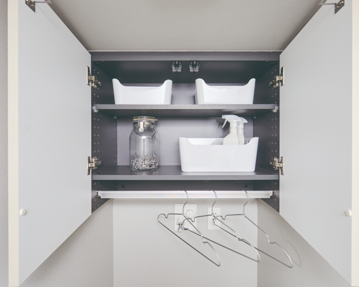 洗濯機置場の上にも収納を装備し、空間を有効利用。洗剤やタオルはもちろん下部にはハンガーパイプが設けられハンガーなどが綺麗に収まります。