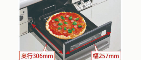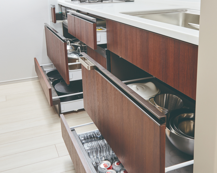 調理器具などが確認しやすく、スムーズに出し入れができるスライド収納を設置しています。