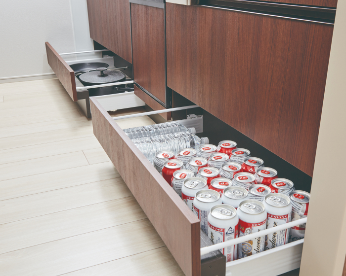 500㎖サイズの缶がそのまま入る高さのフロアコンテナ収納を設置。調理器具や食品類などの収納に便利です。