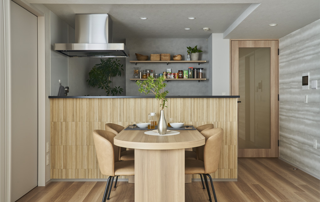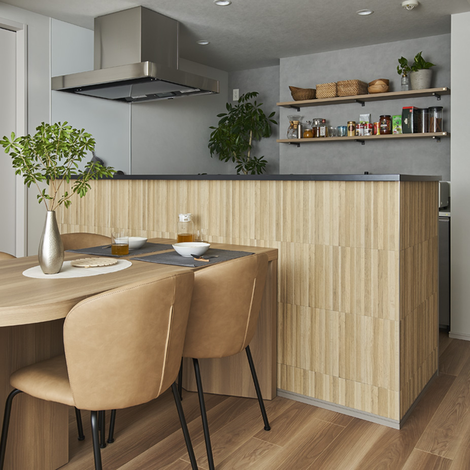 キッチンの側面は通常の壁とは異なるアクセントクロス仕上げとし、リビングとつらなる空間の中で、家具のようにキッチンをしつらえています。