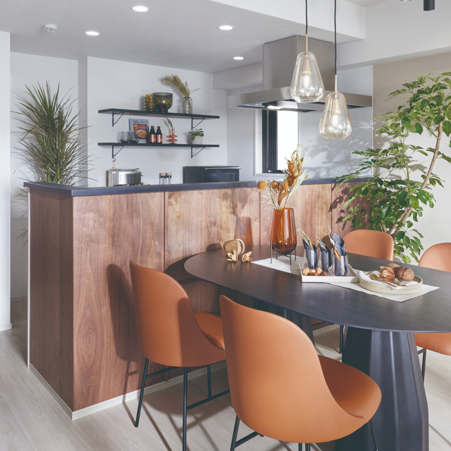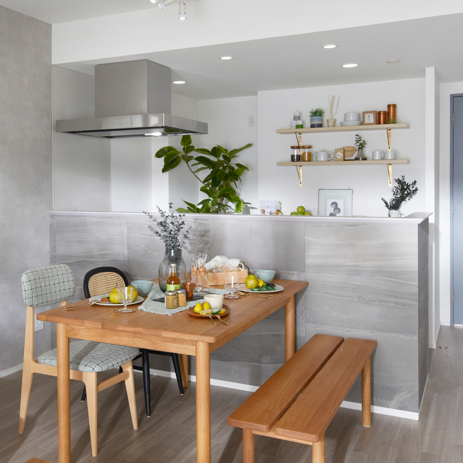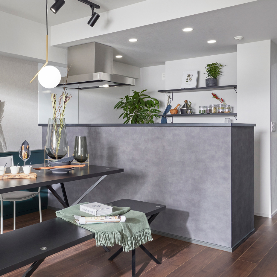 キッチン前に立ち上がりを設けることで、リビングダイニング側から手元の調理スペースを隠し、料理をする姿を美しく見せます。