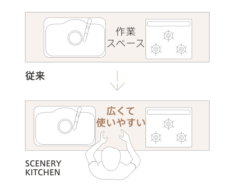 シンクサイズはそのままに、レイアウトを工夫して作業スペースを広げ、スムーズにお料理ができる広々としたワークトップを確保しました。