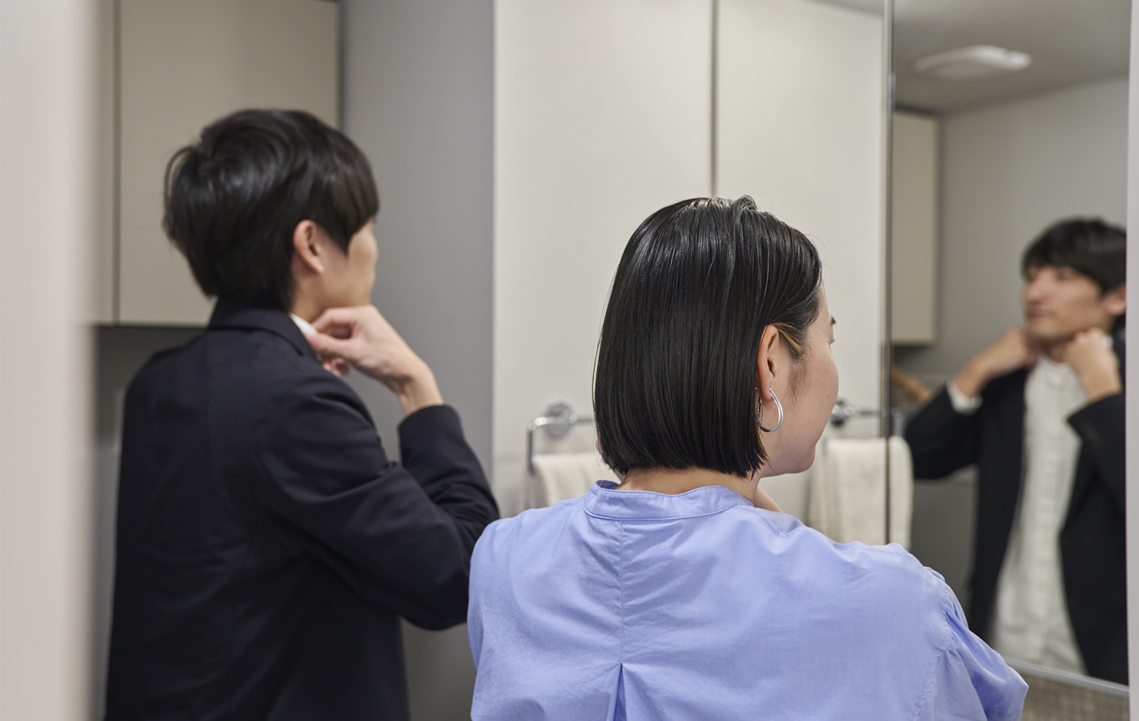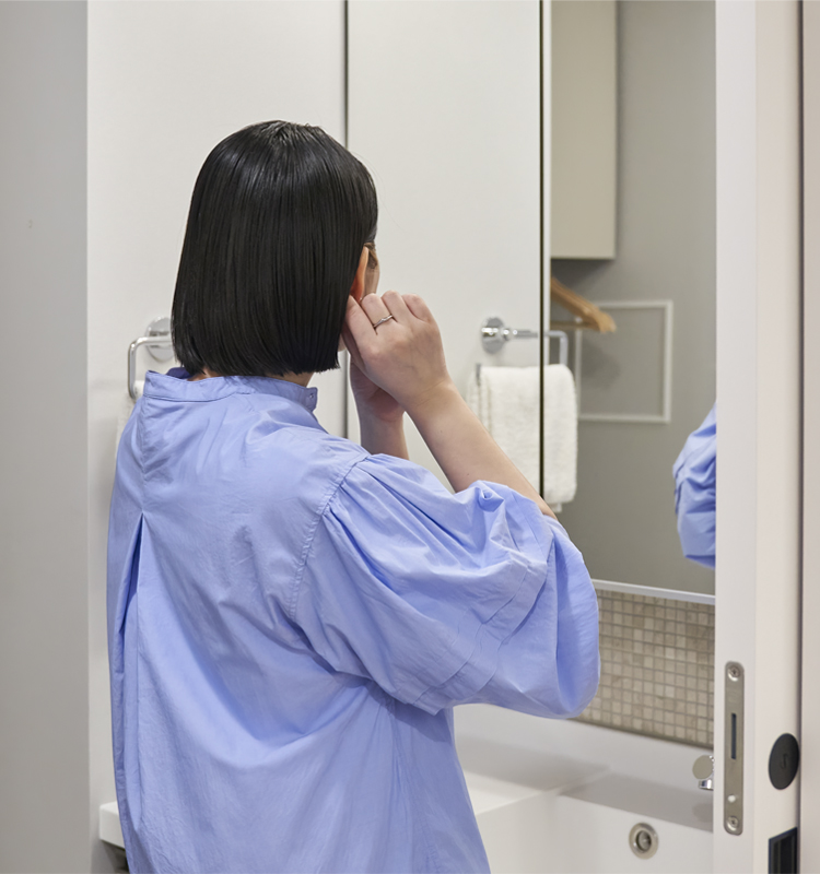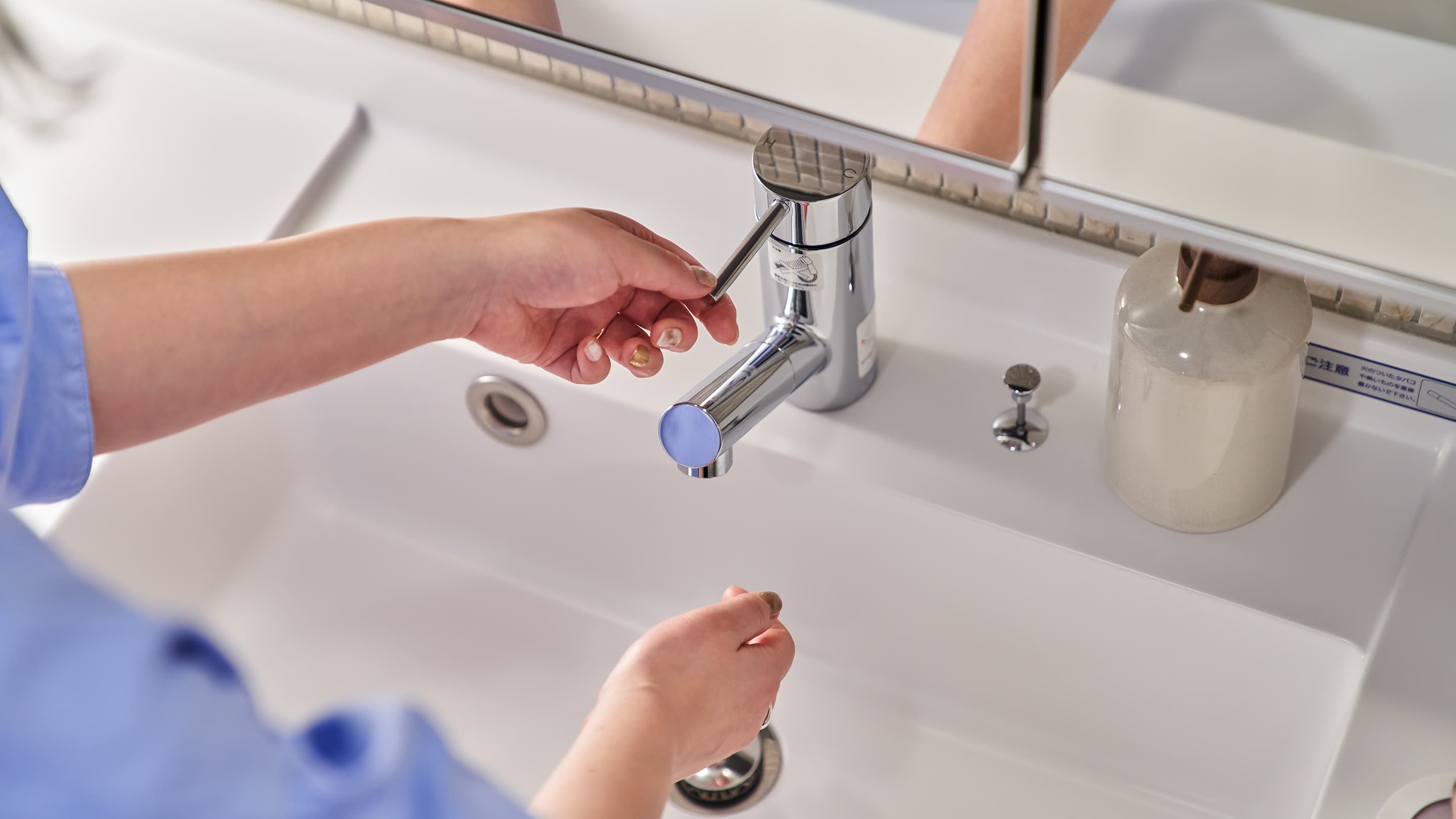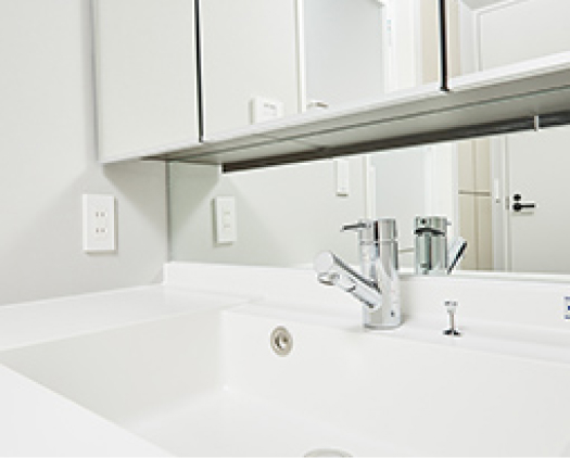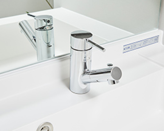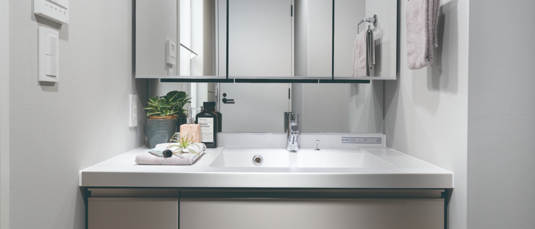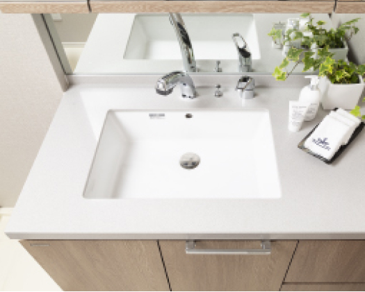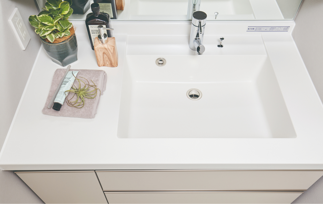 空間をスタイリッシュに引き立て、お手入れも簡単な人工大理石カウンター一体型の洗面ボウルを採用しました。