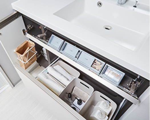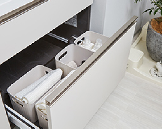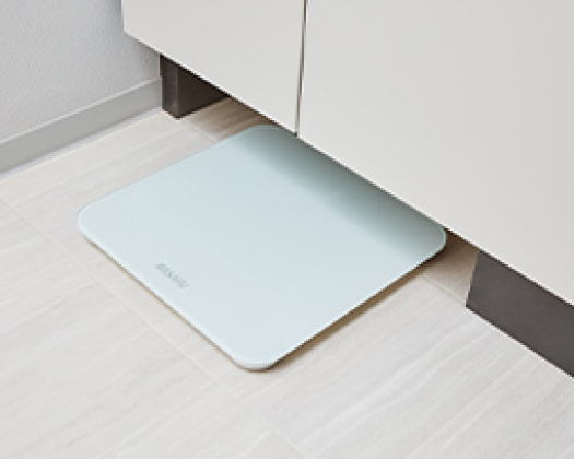 洗面化粧台下のデッドスペースを生かし、ヘルスメーターを手軽に取り出して使える収納スペースを設けています。