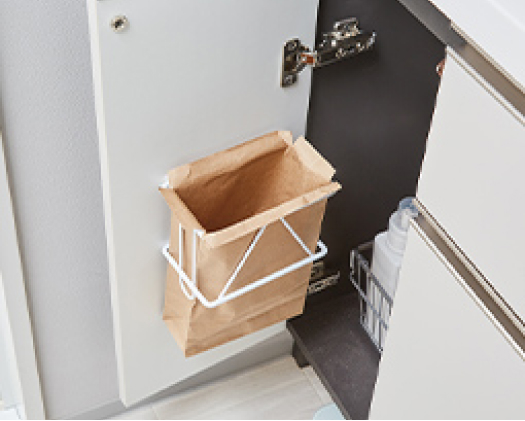 ワンタッチで開く収納扉の裏にホルダーを設置。袋が掛けられ、ゴミが簡単に捨てられます。
