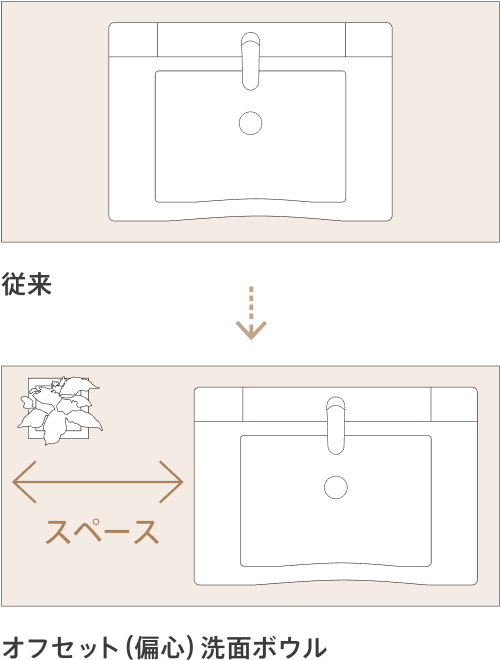 洗面ボウルをサイドに寄せて配置。ボウルの横にまとまったスペースがあるので、小物や化粧品などの置場としても使えます。