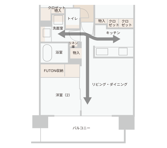 リビングから直接入れる洗面室のレイアウトで、キッチンから洗濯スペース、洗面化粧台、バスルームとアクセスしやすい動線で水回りの家事効率を高めます。