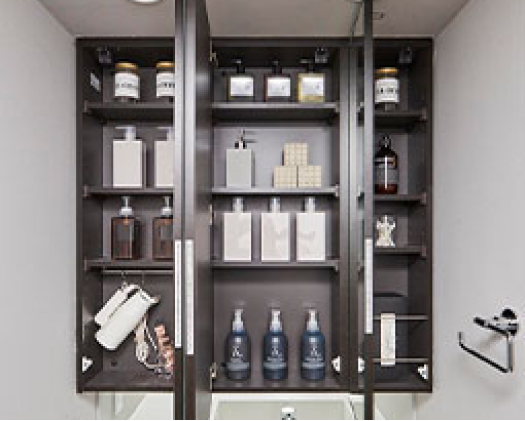 鏡裏はすべて収納スペース。ドライヤー置き場も用意しました。