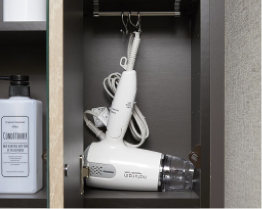 鏡裏収納にパイプとS字フックを設置して、ドライヤーをスムーズに収納できるようにしました。