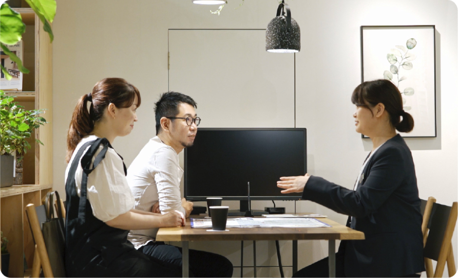 テーブルに広げられた間取り図を見ながら相談する様子