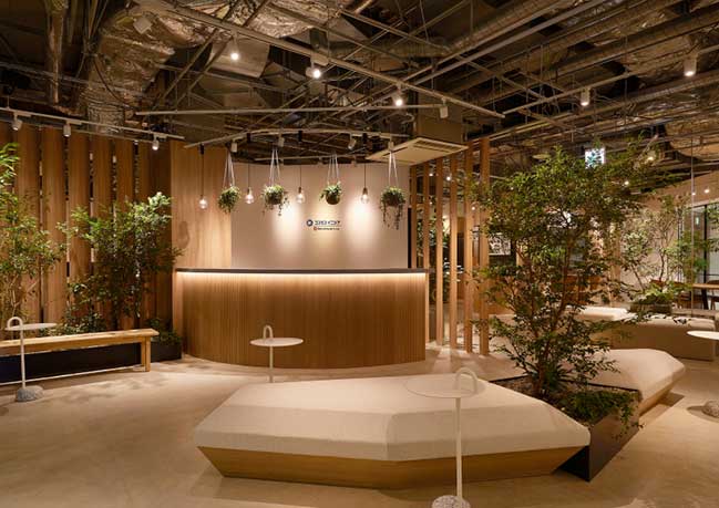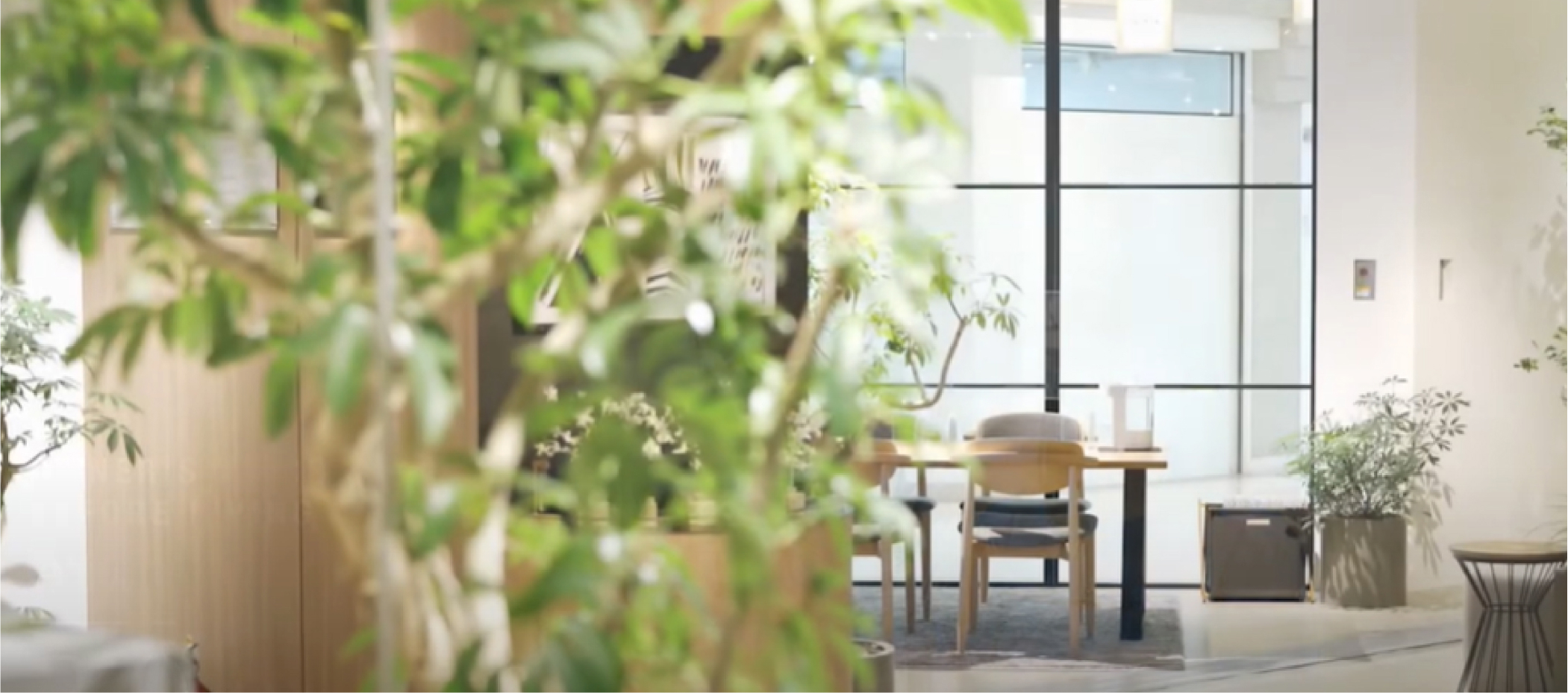 緑の植物が飾られたラウンジスペース