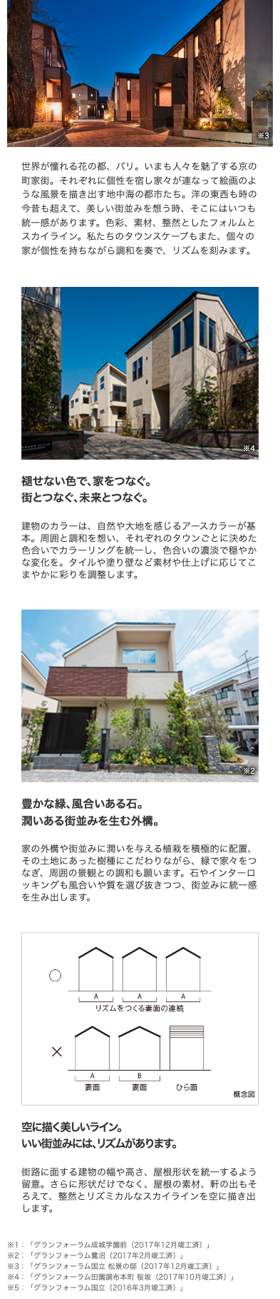 世界が憧れる花の都、パリ。いまも人々を魅了する京の町家街。それぞれに個性を宿し家々が連なって絵画のような風景を描き出す地中海の都市たち。洋の東西も時の今昔も超えて、美しい街並みを想う時、そこにはいつも統一感があります。色彩、素材、整然としたフォルムとスカイライン。私たちのタウンスケープもまた、個々の家が個性を持ちながら調和を奏で、リズムを刻みます。