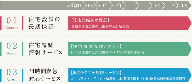 住み始めた時の嬉しさや満足感を、いつまでも保ち続けることは、住まいの一つの理想といえます。コスモスイニシアでは、長い年月とともに、住まいをしっかりとメンテナンスすることで、喜びや快適さを維持していきたいと考えています。「オーナーズサポート」では、ご入居後の10年間の長期にわたって、住宅設備に不具合が起きた場合にも、無料で修理を実施。メーカー保証だけではカバーできない安心を、しっかりとお届けします。