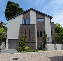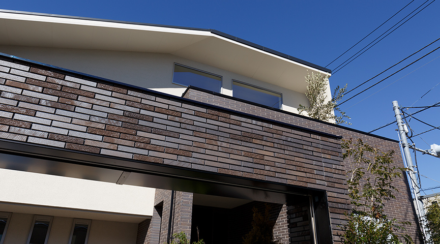 住まいの印象をシェイプアップ。ボックスやバルコニーを設置できない大きな壁面の場合は、タイルの縦ライン貼りを採用。そのラインがスリットとなって壁面を分けることで、すっきりとボリューム感を抑えます。さらに、タイルのラインの幅は窓などの開口とそろえ、整然ときれいなデザインに仕上げます。
