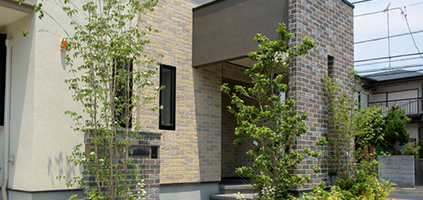 アプローチに奥行きを生み出す。玄関には、上部の庇も組み合わせながら飾り壁を設けることで、アプローチに深い奥行きを生み出します。同時にそこに大きな陰翳をつくり出すことで、周囲との境界性を強調。外からの視線も和らげ、玄関まわりの品格やプライバシーを高めます。