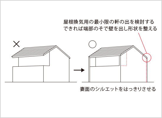 つまり、端整ということ。切り妻や片流れの屋根では、軒は抑えるデザインルールを設定。壁面をすっきりと整えます、さらにバルコニーを設置する際も、ひら面に袖壁をあしらうことによって、軒の出ない、端整なファサードを仕立てます。